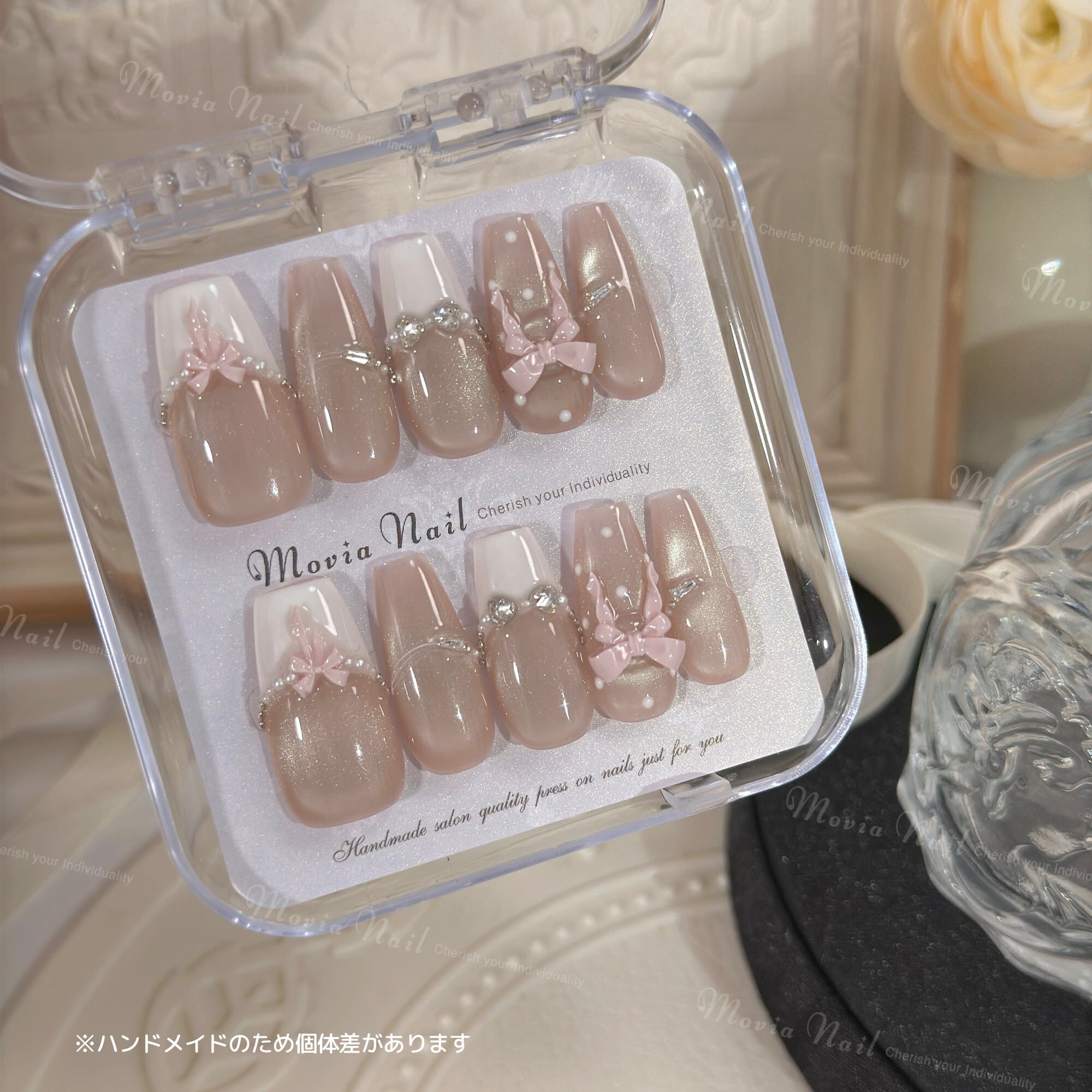 WH No.288【ミディアムコフィン】ホワイトピンクベージュ量産型地雷系マグネットリボンフレンチ水玉サブカル姫ギャルネイルチップ現品