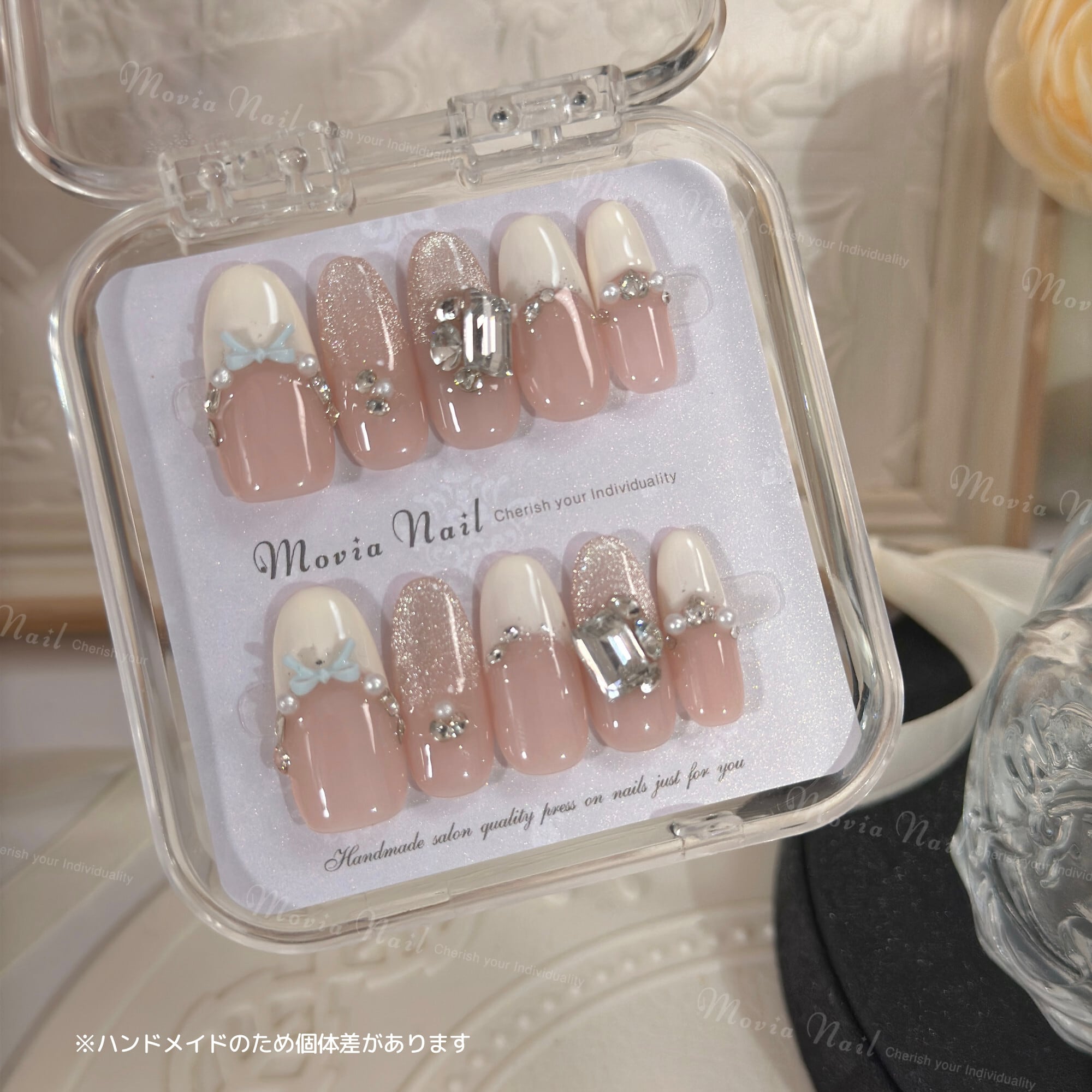 WH No.292【セミロングオーバル】ホワイトベージュ量産型地雷系マグネットフレンチリボンサブカル姫ギャルネイルチップ現品