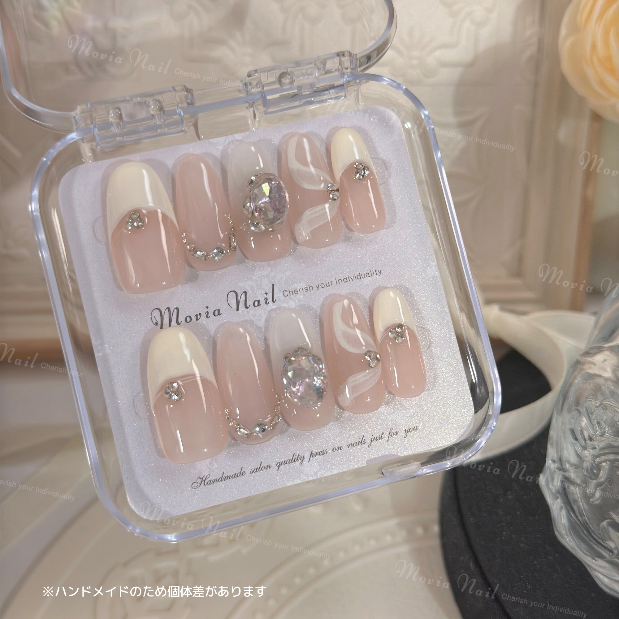WH No.352【セミロングオーバル】ホワイト量産型地雷系フレンチリボンサブカル姫ギャルネイルチップ現品